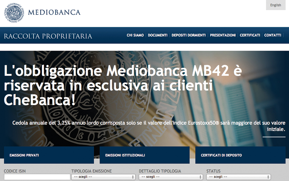 Raccolta Proprietaria Mediobanca - Restyling 2014Dopo il restyling grafico del sito corporate Engitel ha sviluppato il nuovo progetto per il sito di Mediobanca dedicato a Raccolta Proprietaria.