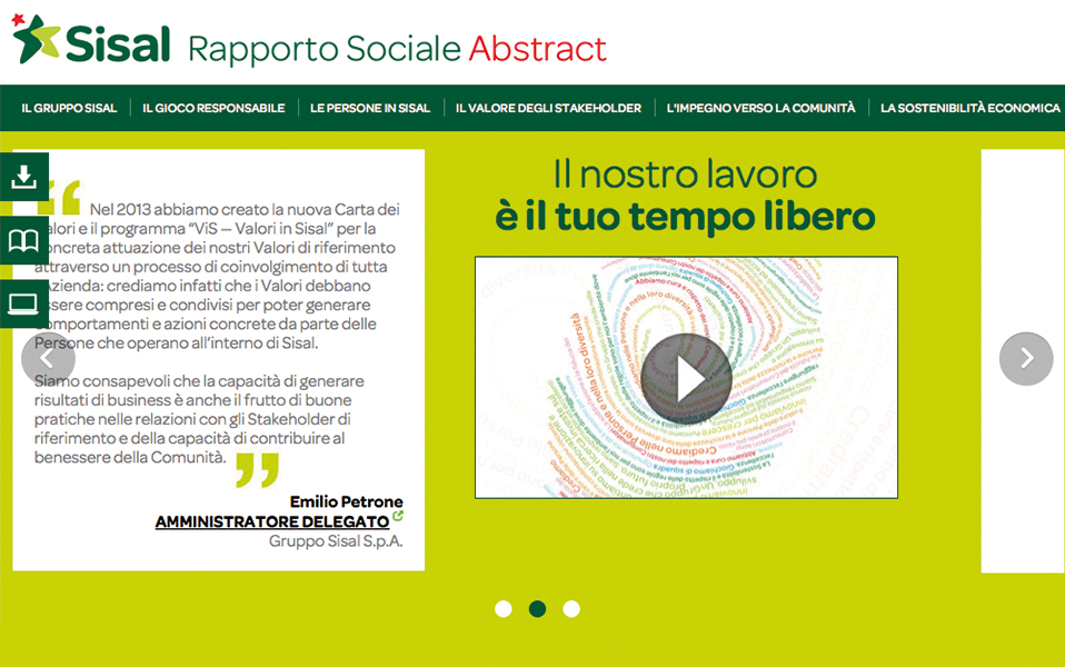 Sisal - Rapporto SocialeNel suo percorso di innovazione e ricerca Sisal ha scelto, fin dalle origini, di perseguire uno sviluppo sostenibile, mirato a bilanciare la crescita del business con la Responsabilità Sociale.