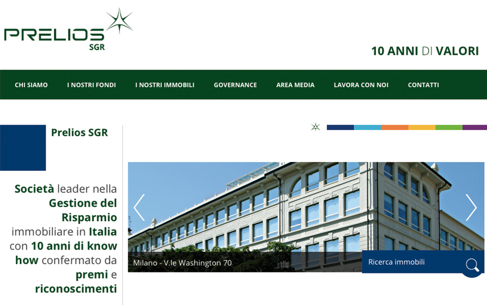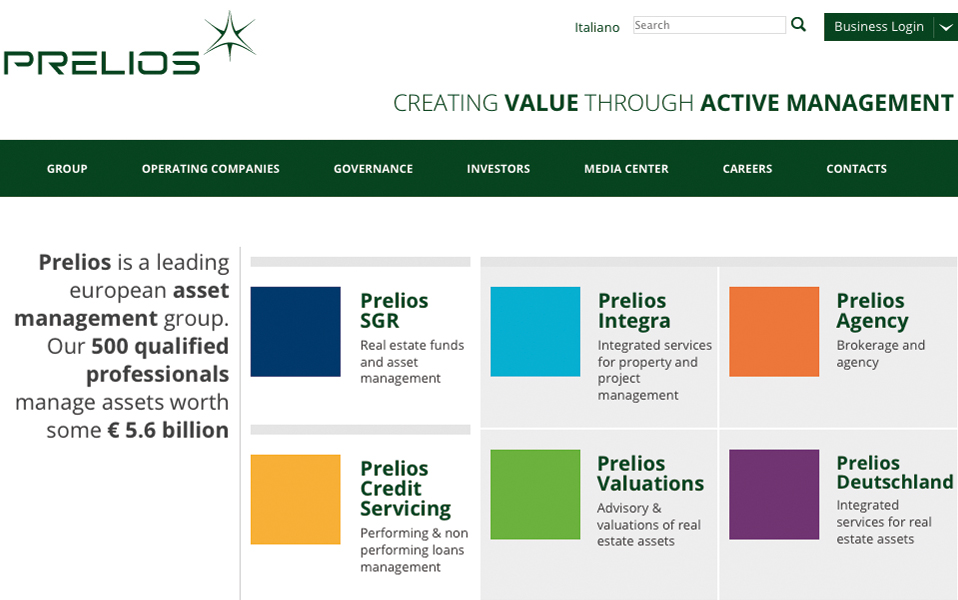 Prelios SGREngitel, nell'ambito del progetto di restyling dei siti web del Gruppo Prelios, ha realizzato il nuovo sito per Prelios SGR (90% Prelios S.p.A., 10% Intesa Sanpaolo), la Società di Gestione del Risparmio immobiliare del Gruppo Prelios.
