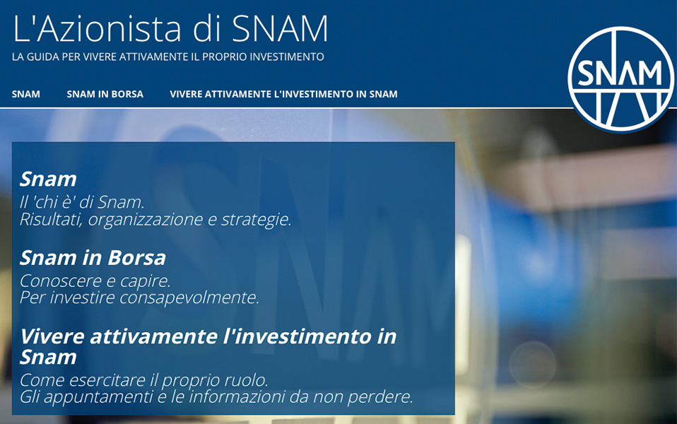 Snam - Guida all’AzionistaEngitel, grazie al CMS Spin&Go, ha realizzato la nuova Guida all’Azionista per Snam sia in versione di sito web interattivo che in versione cartacea, tutto a partire dallo stesso database.
