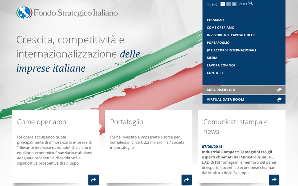 Fondo Strategico – Restyling 2013Il Fondo Strategico Italiano Spa (FSI), holding di partecipazioni il cui azionista strategico è la Cassa Depositi e Prestiti, continua la collaborazione con Engitel affidandole il restyling grafico del sito istituzionale.