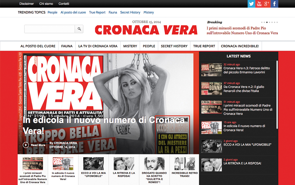 Cronaca VeraÈ online il sito di Cronaca Vera. Nata nel 1969, è una rivista che viene pubblicata da 44 anni.
