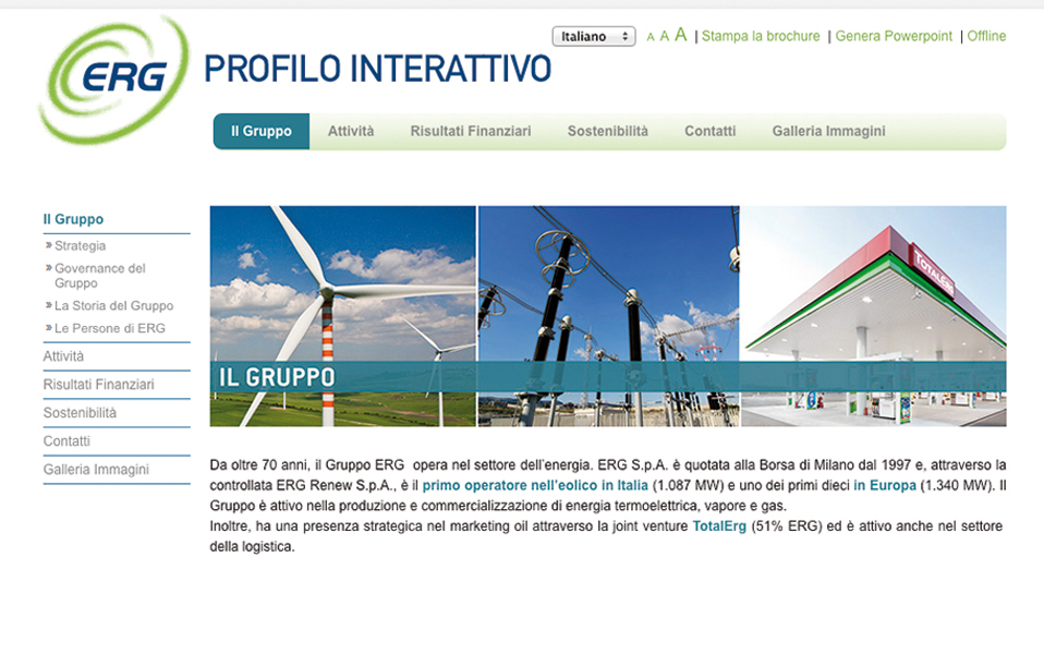 ERG - Profilo interattivoEngitel, tramite la piattaforma di content management Spin&Go nella nuova versione Multichannel Publishing, ha realizzato il sito profilointerattivo.erg.it.