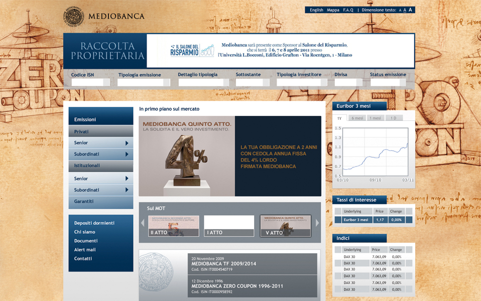 Mediobanca - raccolta proprietariaIl sito Raccolta Proprietaria raccoglie e presenta tutte le informazioni sulle Emissioni di Mediobanca, con dati, grafici e documenti aggiornati in tempo reale.