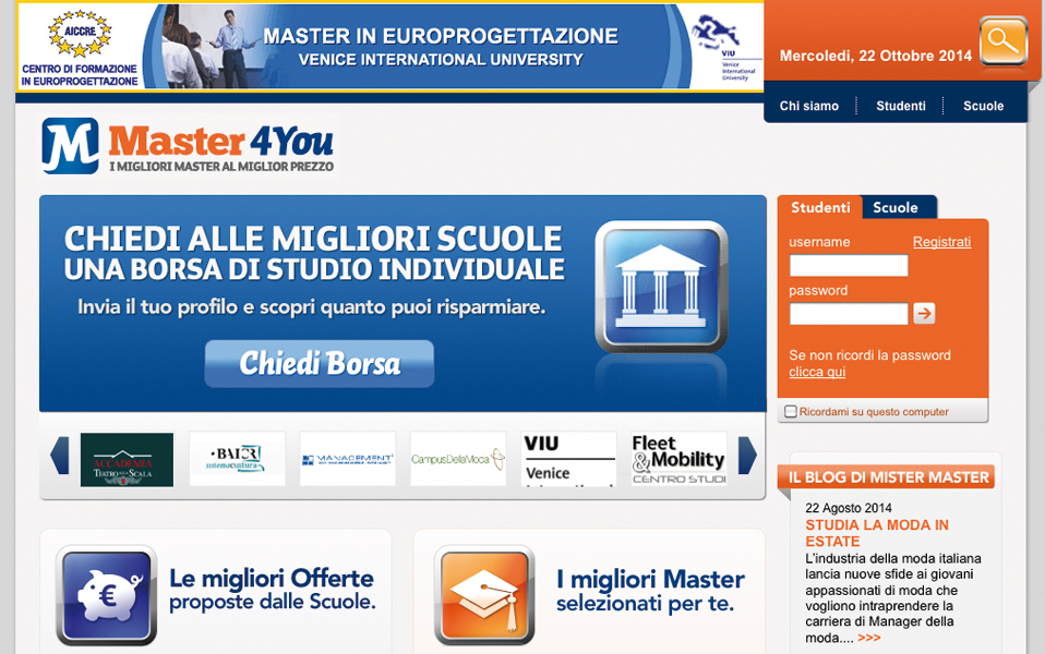 Master4YouÈ on line il nuovo sito Master4You, un servizio web che fa incontrare domanda e offerta di master e corsi di alta formazione in Italia, permettendo a ciascuno di trovare il master giusto per sé e di acquistarlo a un prezzo equo.