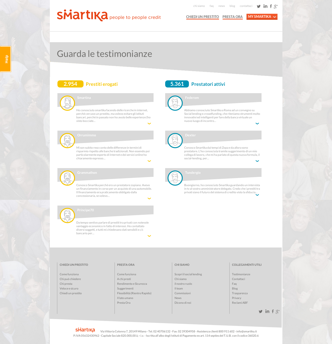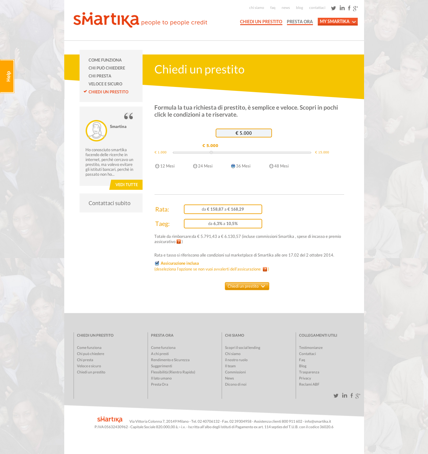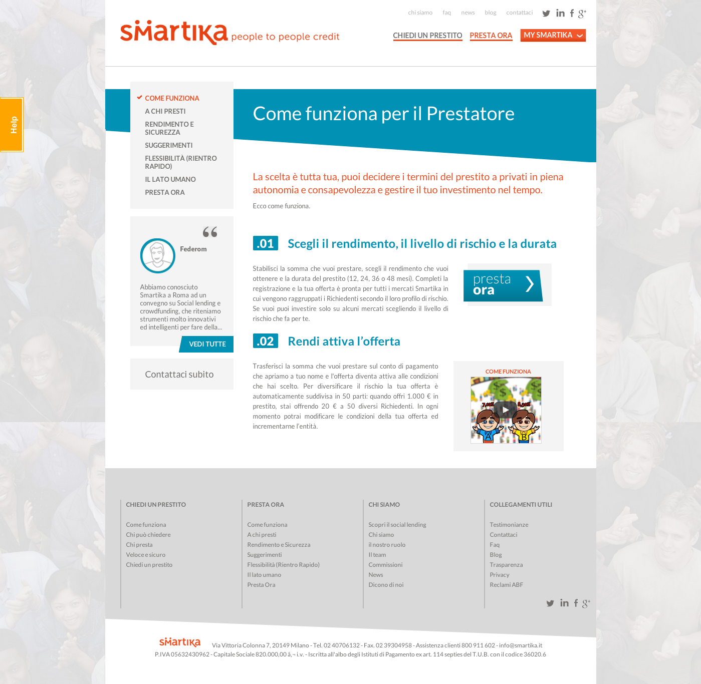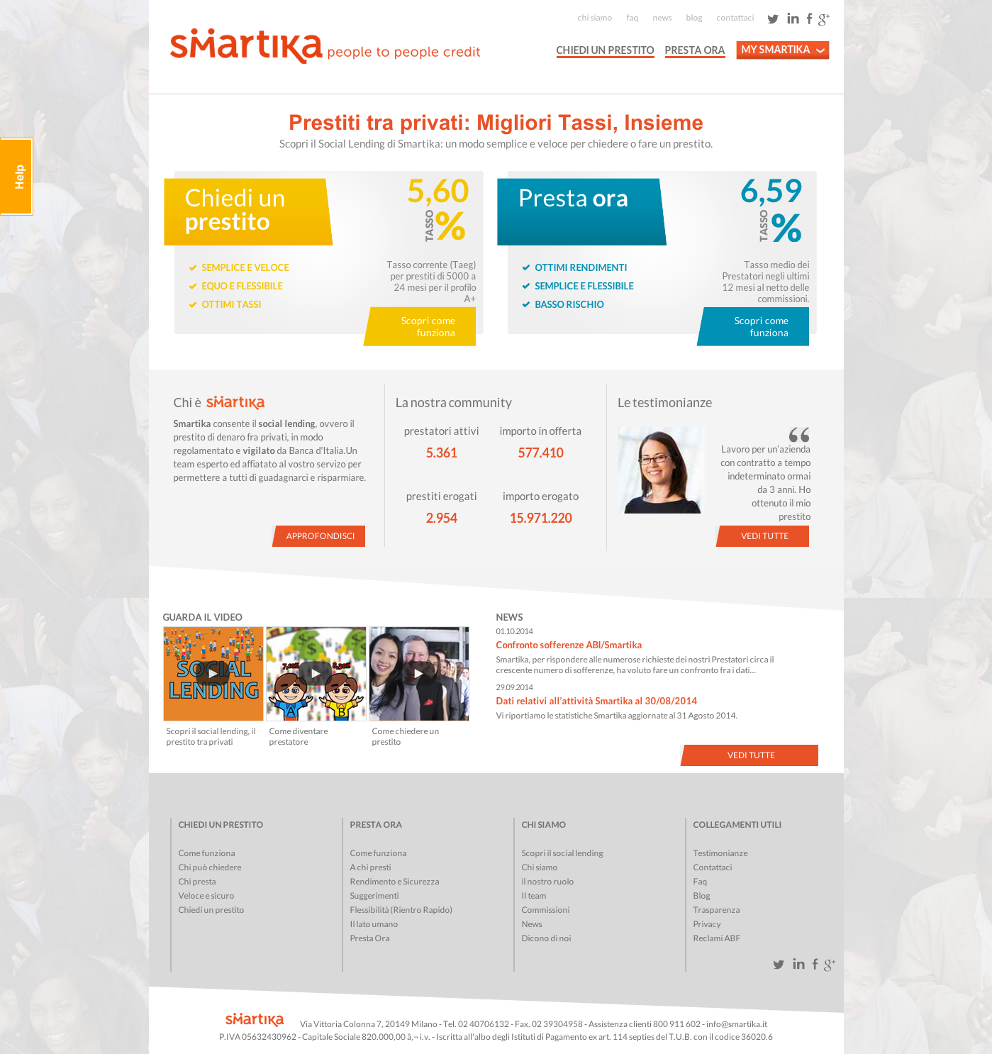 Engitel ha realizzato un sito web dinamico e multi-color, dedicato a prestatori e richiedenti, i due target di riferimento di Smartika. Il claim così come i due target sono ben visibili in home page in modo da trasmettere subito chiarezza e trasparenza del tipo di business in cui Smartika opera. Una sezione del sito è stata dedicata interamente alle testimonianze vere di prestatori e richiedenti.