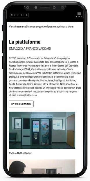 NEFFIE, an acronym for "Photographic Neuroaesthetics," is a multidisciplinary project curated and developed by the collaboration between the Research Center for Advanced Technologies for Health and Well-Being of San Raffaele Hospital, and ICONE, European Center for Research in History and Theory of the Image of the Vita-Salute San Raffaele University of Milan.