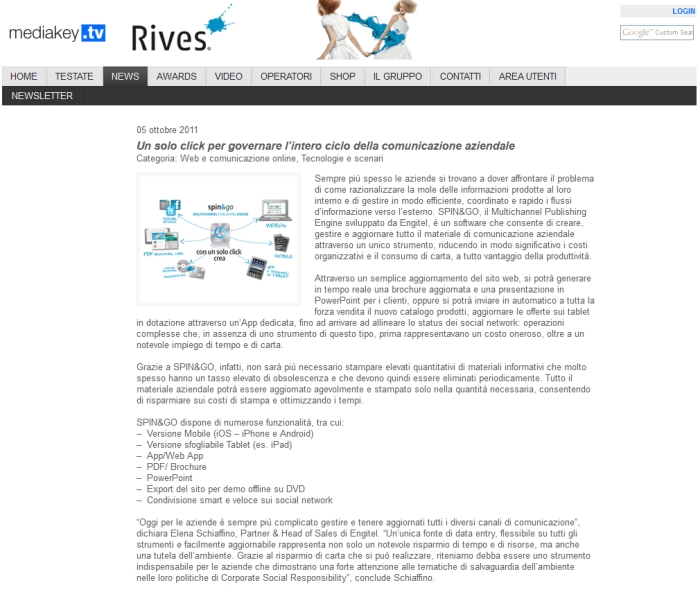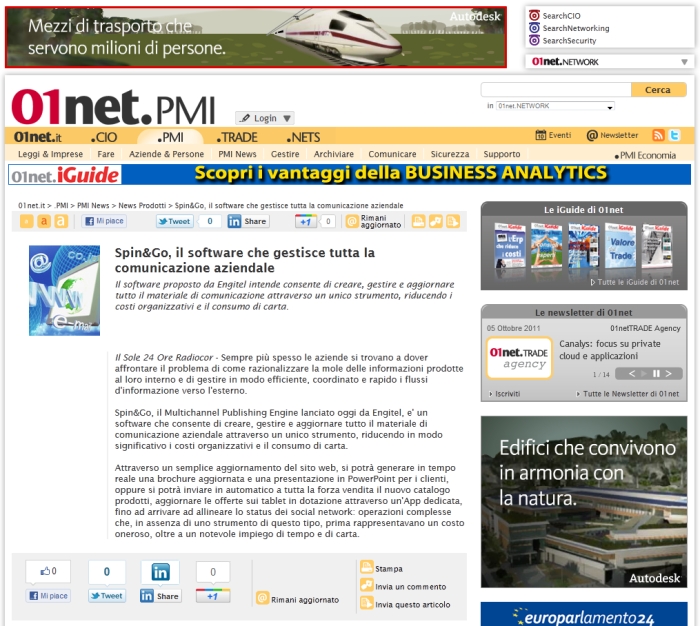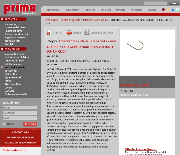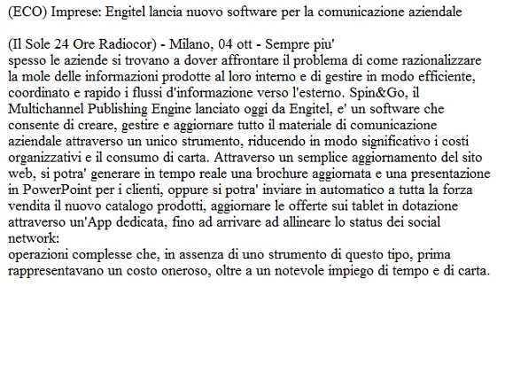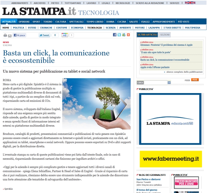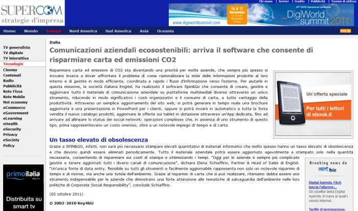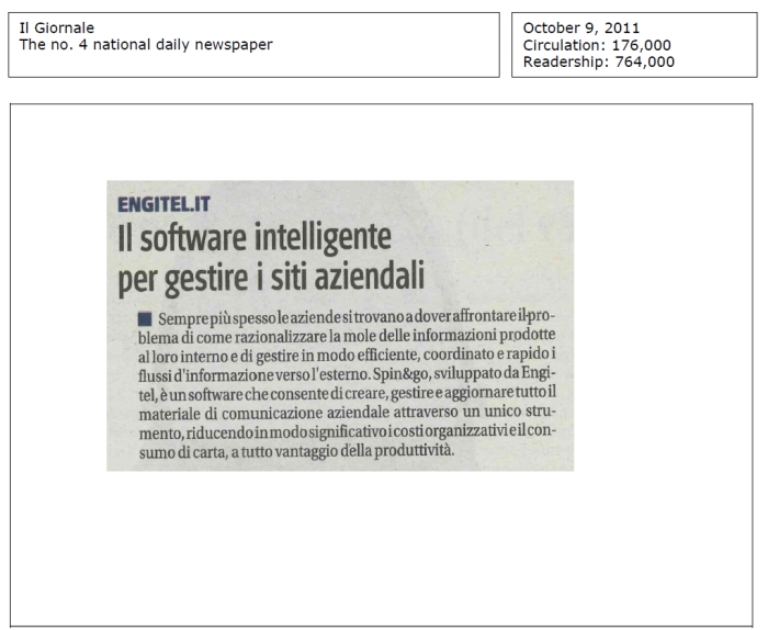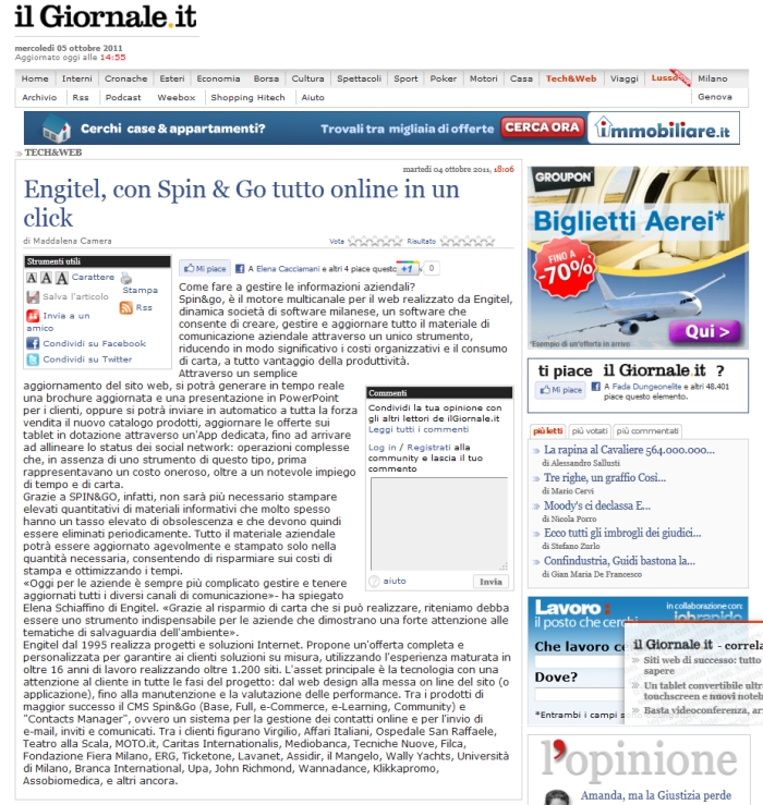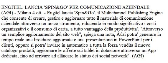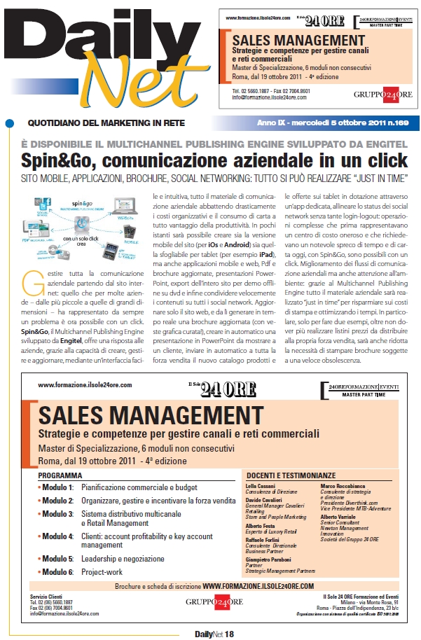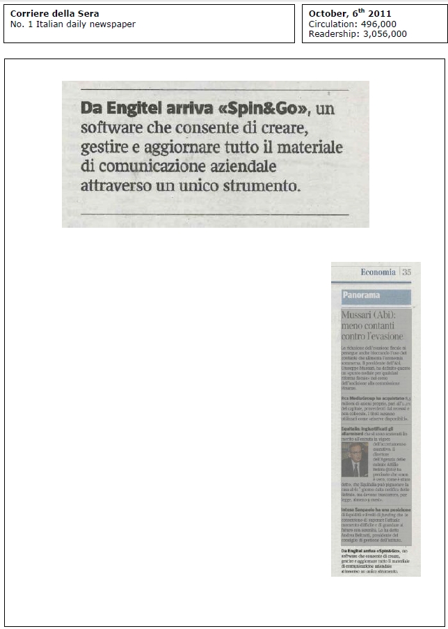 06/10/2011Da Engitel arriva "Spin&Go", un software che consente di creare, gestire e aggiornare tutto il materiale di comunicazione aziendale attraverso un unico strumentoCorriere della Sera