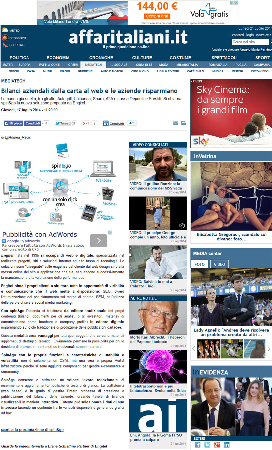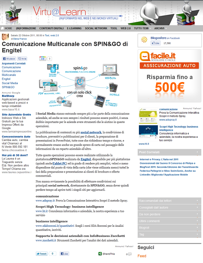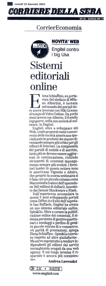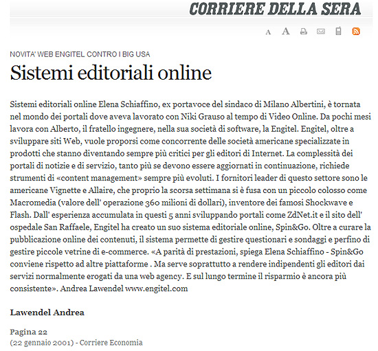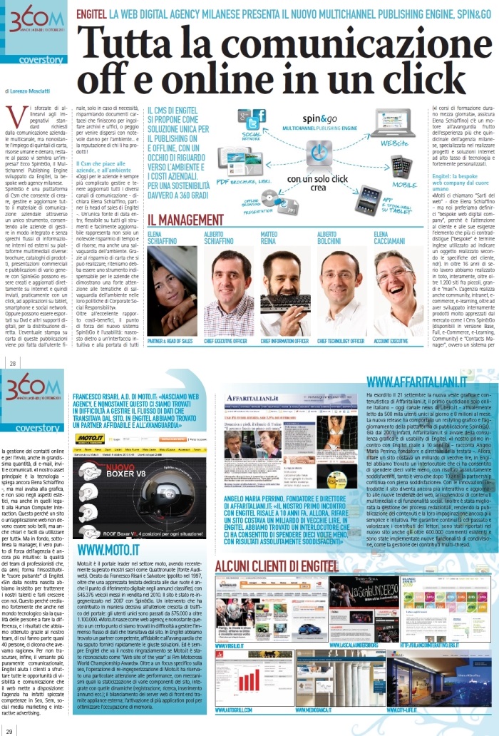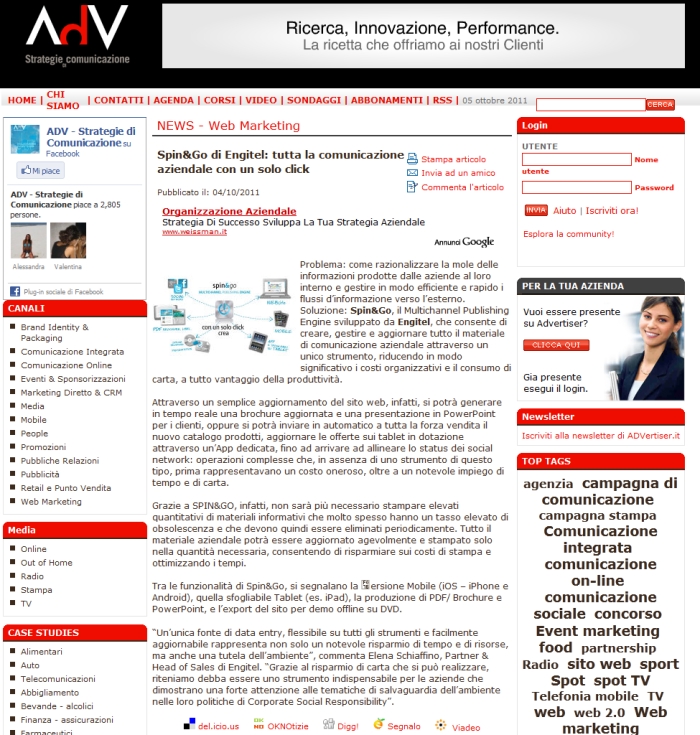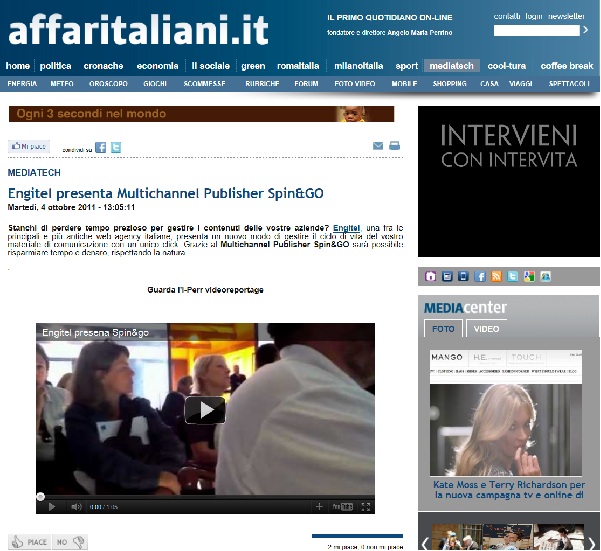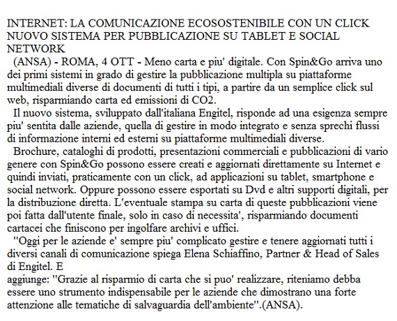 06/10/2011Da Engitel arriva "Spin&Go", un software che consente di creare, gestire e aggiornare tutto il materiale di comunicazione aziendale attraverso un unico strumentoCorriere della Sera