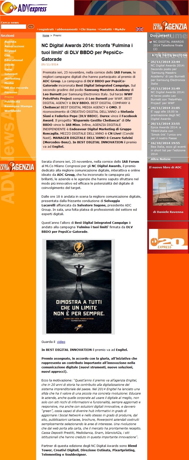25/11/2014NC Digital Awards 2014: trionfa 'Fulmina i tuoi limiti' di DLV BBDO per PepsiCo-GatoradeADVexpress