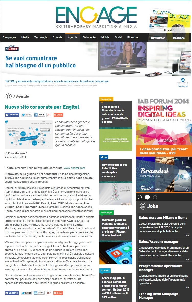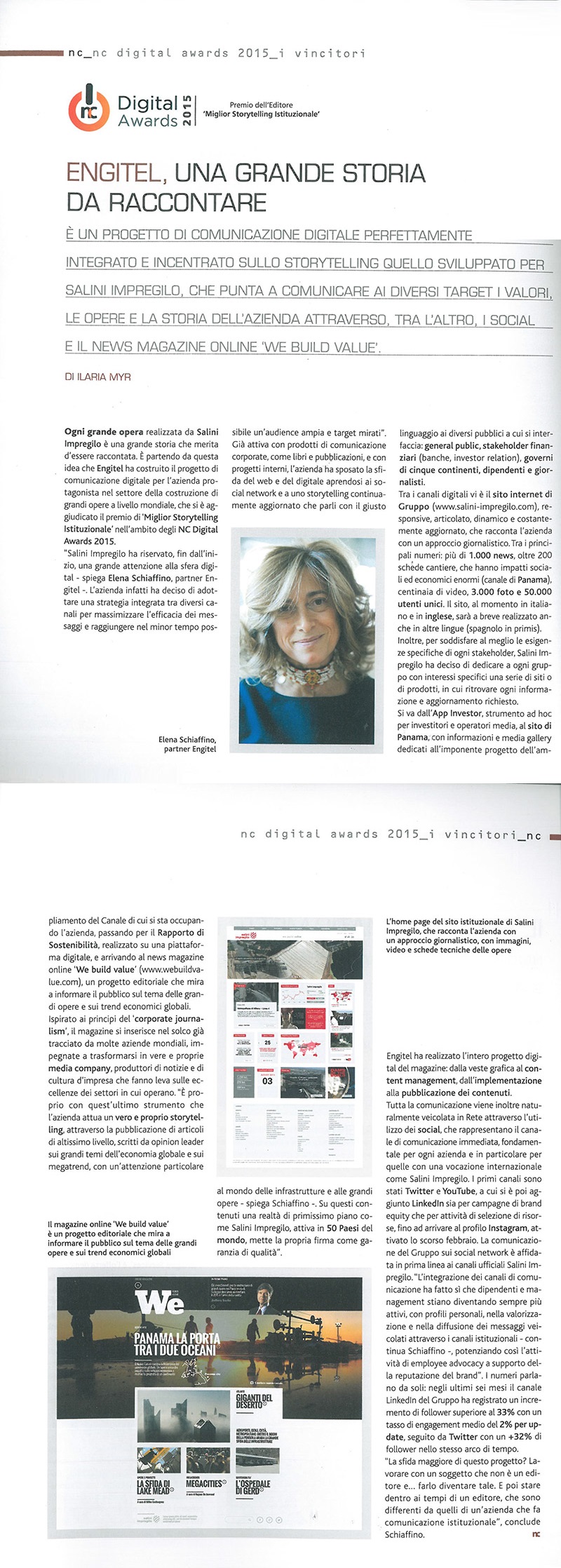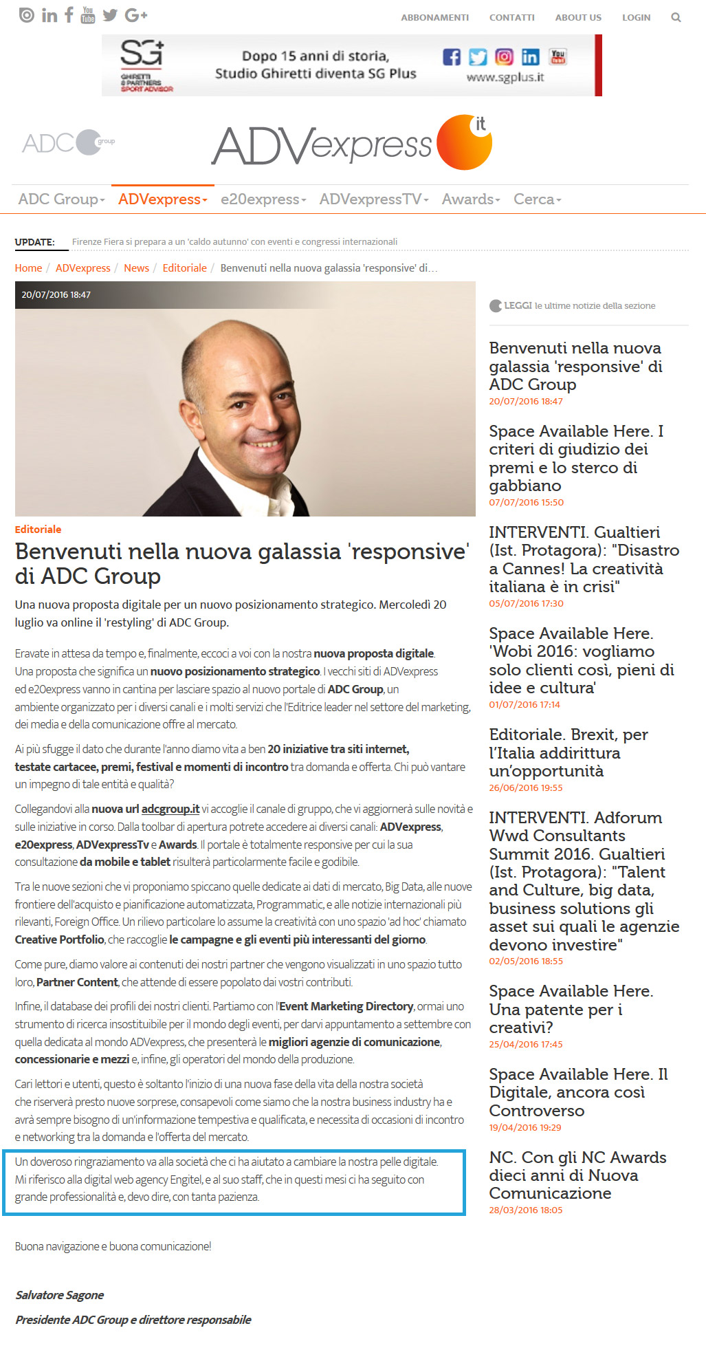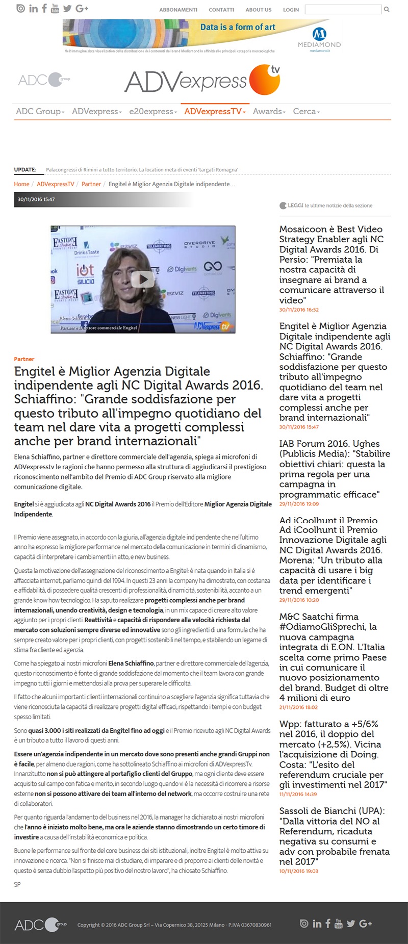 30/11/2016Engitel è Miglior Agenzia Digitale indipendente agli NC Digital Awards 2016. Schiaffino: "Grande soddisfazione per questo tributo all'impegno quotidiano del team nel dare vita a progetti complessi anche per brand internazionali"ADC Group