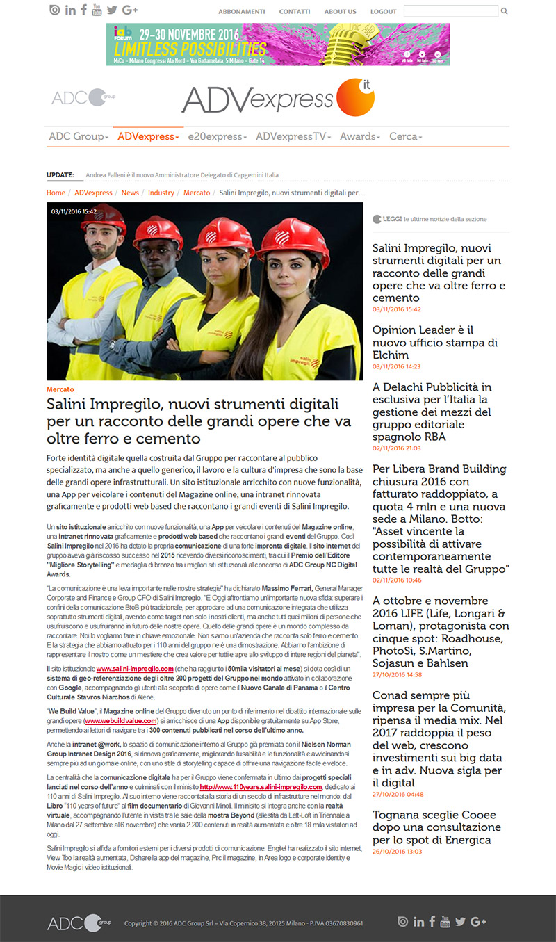 03/11/2016Salini Impregilo, nuovi strumenti digitali per un racconto delle grandi opere che va oltre ferro e cementoADC Group