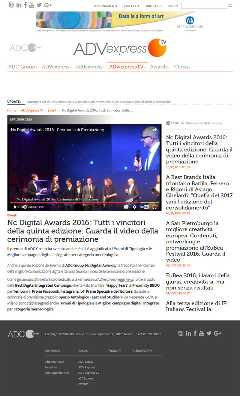 25/11/2016NC Digital Awards: Tutti i vincitori della quinta edizione. Guarda il video della cerimonia di premiazioneADC Group