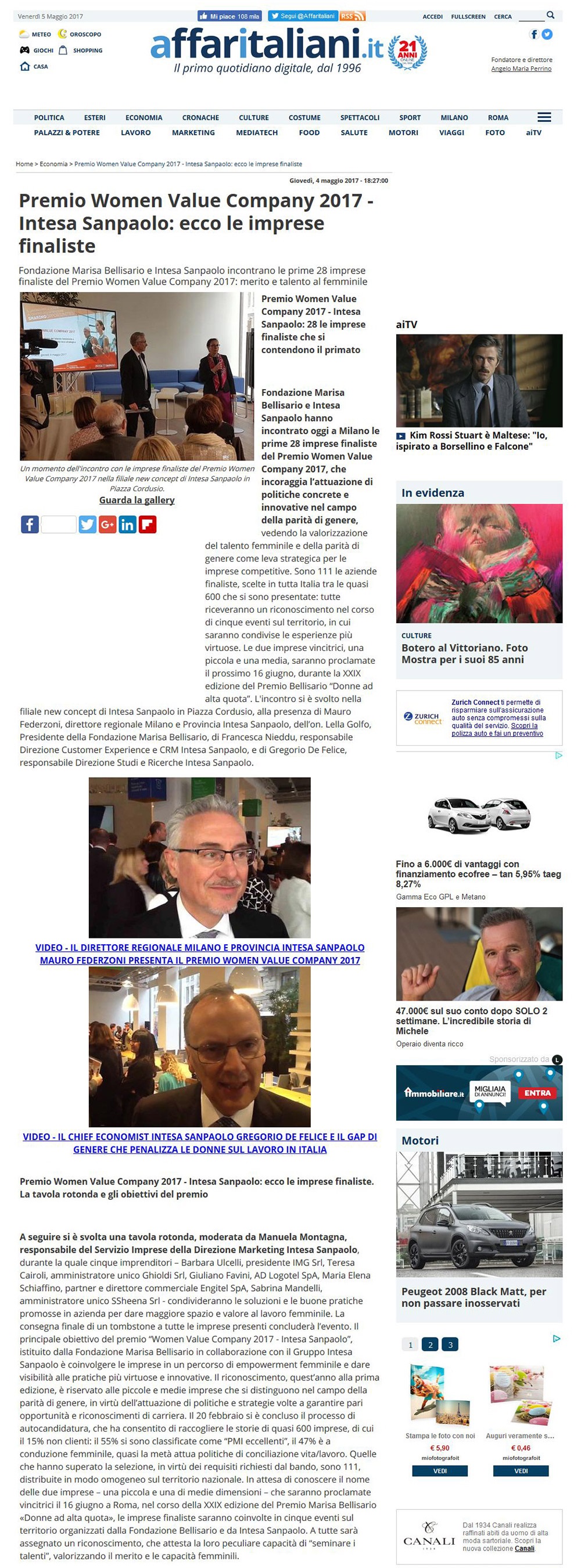 04/05/2017Premio Women Value Company 2017 - Intesa San Paolo: ecco le imprese finalisteAffaritaliani.it