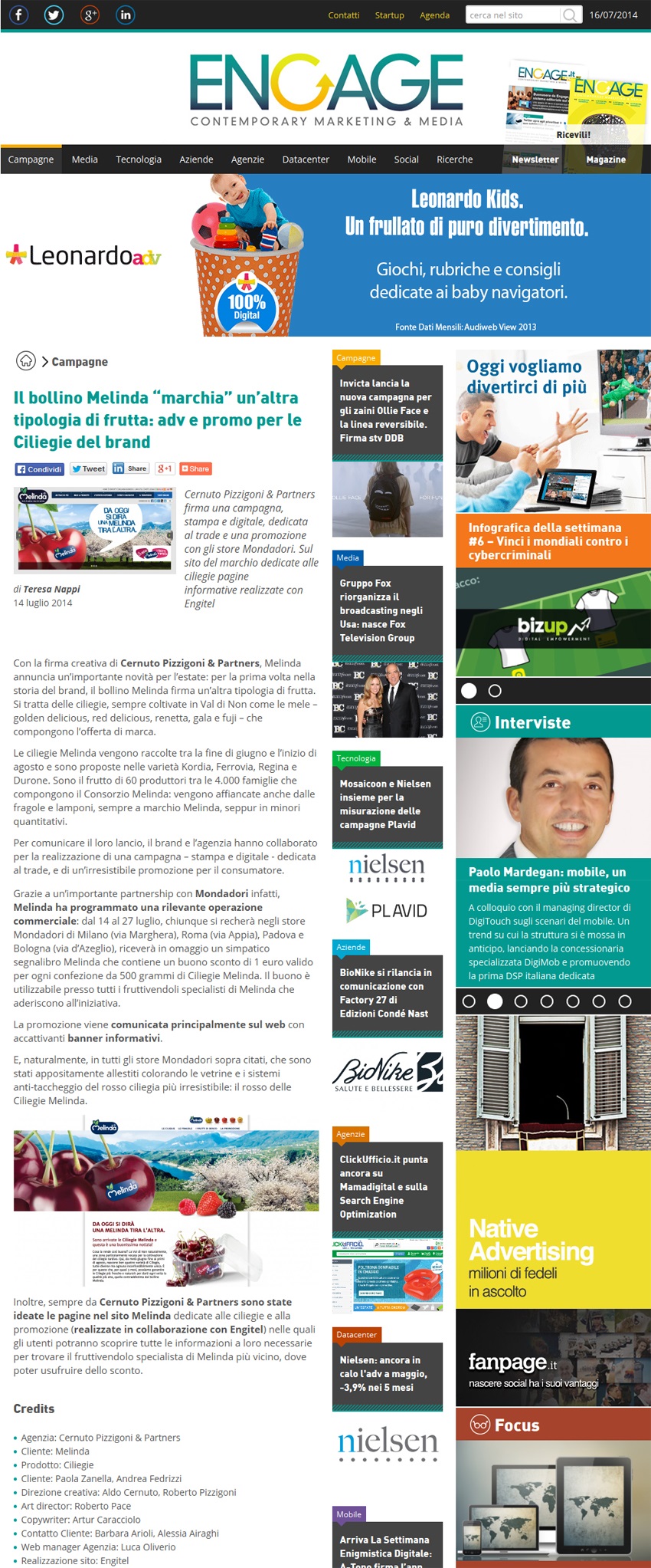 14/07/2014Il bollino Melinda "marchia" un'altra tipologia di frutta: adv e promo per le ciliegie del brandEngage