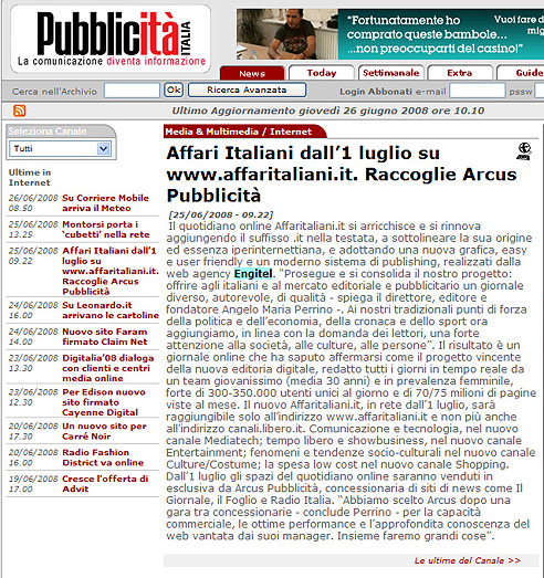 26/06/2008Affari Italiani dall'1 luglio su www.affaritaliani.it. Raccoglie Arcus PubblicitàPubblicità Italia