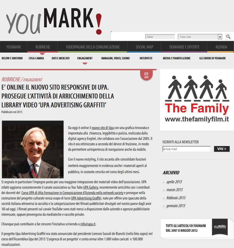 10/04/2015È online il nuovo sito responsive di UPA. Prosegue l'attività di arricchimento della library video 'UPA Advertising Graffiti'YouMark